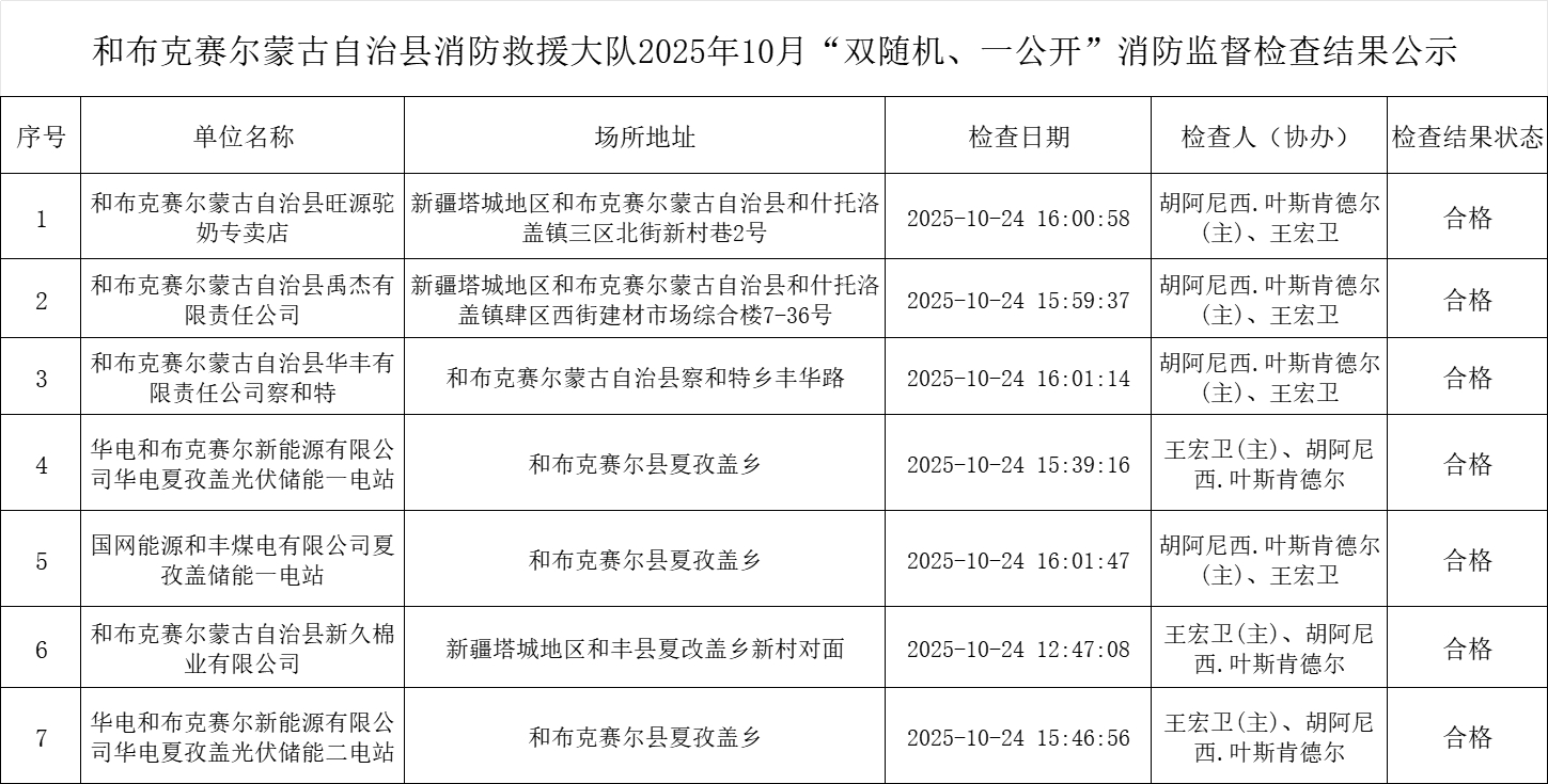 和布克赛尔蒙古自治县消防救援大队2025年10月“双随机、一公开”消防监督检查结果