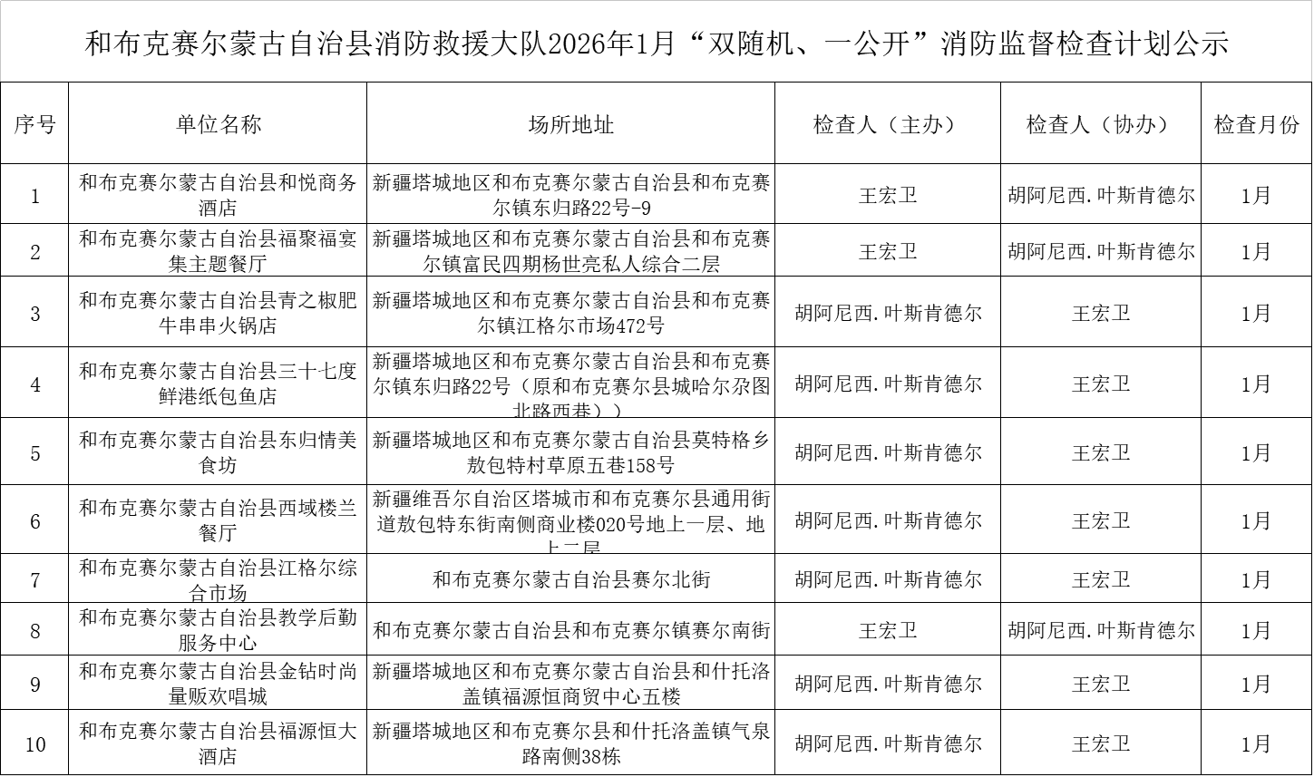 和布克赛尔蒙古自治县消防救援大队2026年1月“双随机、一公开”消防监督检查计划公示