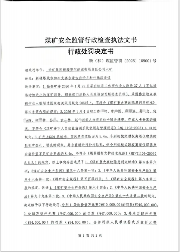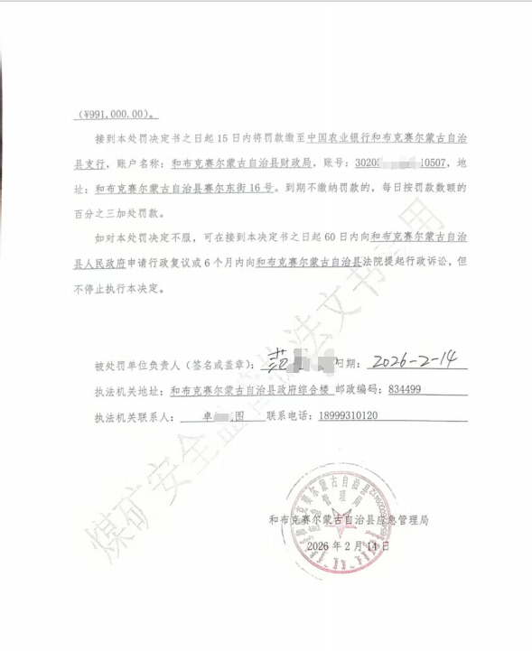 煤矿安全监管行政检查执法文书 行政处罚决定书 新(和)煤监管罚[2026]109001号