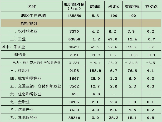 受商品销售额增幅较好的影响,批发零售业完成增加值1667万元,同比增长28%;住宿餐饮业实现增加值63万元,同比下降6.9%,因总量较小,对生产总值没有产生拉动作用;受铁路、公路客货周转量和装卸搬运和仓储业营业收入增长较好的影响,全县交通运输、仓储和邮政业实现增加值3562万元,同比增长12.7%;金融业实现小幅增长,全县金融业增加值3206万元,同比增长2.1%;房地产业增加值7628万元,同比增长3%;其他服务业增加值3.83亿元,同比增长3%。