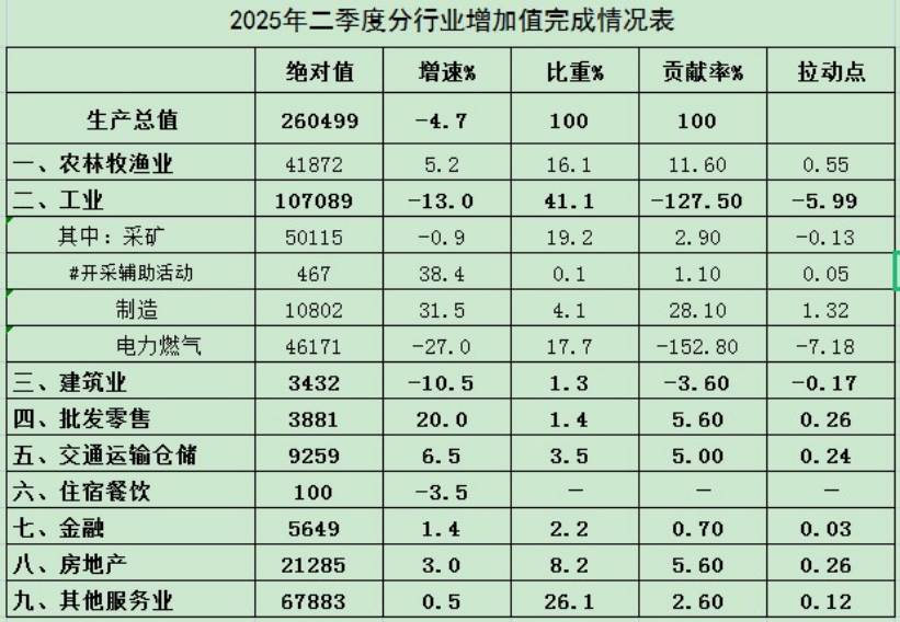 (二)第二产业压力较大。规上工业支撑力不足,二季度规上工业增加值同比下降9%,与一季度的增长5%相比,下降了14个百分点,对第二产业增长的支撑拉动大幅下滑。其中,规上工业中的采矿业、电力热力和水的生产供应业这两大核心门类大幅下降,采矿业较一季度下降了47.3个百分点,电力热力和水的生产供应业降幅较一季度虽然收窄18.7个百分点,但同比仍然下降了26.8%,制造业虽然实现在较好的增长,但由于在规上工业中的占比仅有10%左右,难以支撑规上工业整体增长。建筑业市场增长乏力,三家建筑业企业签订合同额“两降一增”,赛尔山市政工程有限公司和正升建设工程有限责任公司分别下降了31.2%、28.6%,全荣建设工程有限公司合同额虽然涨幅较大,但合同额仅占36.6%,支撑作用有限,要实现建筑业核算的两项指标(建筑业总产值增速、建筑业企业增值税发票含税销售额(项目在本地)增速由负转正压力较大。