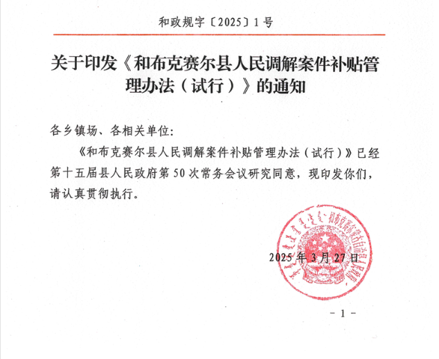 关于印发《和布克赛尔县人民调解案件补贴管理办法(试行)》的通知