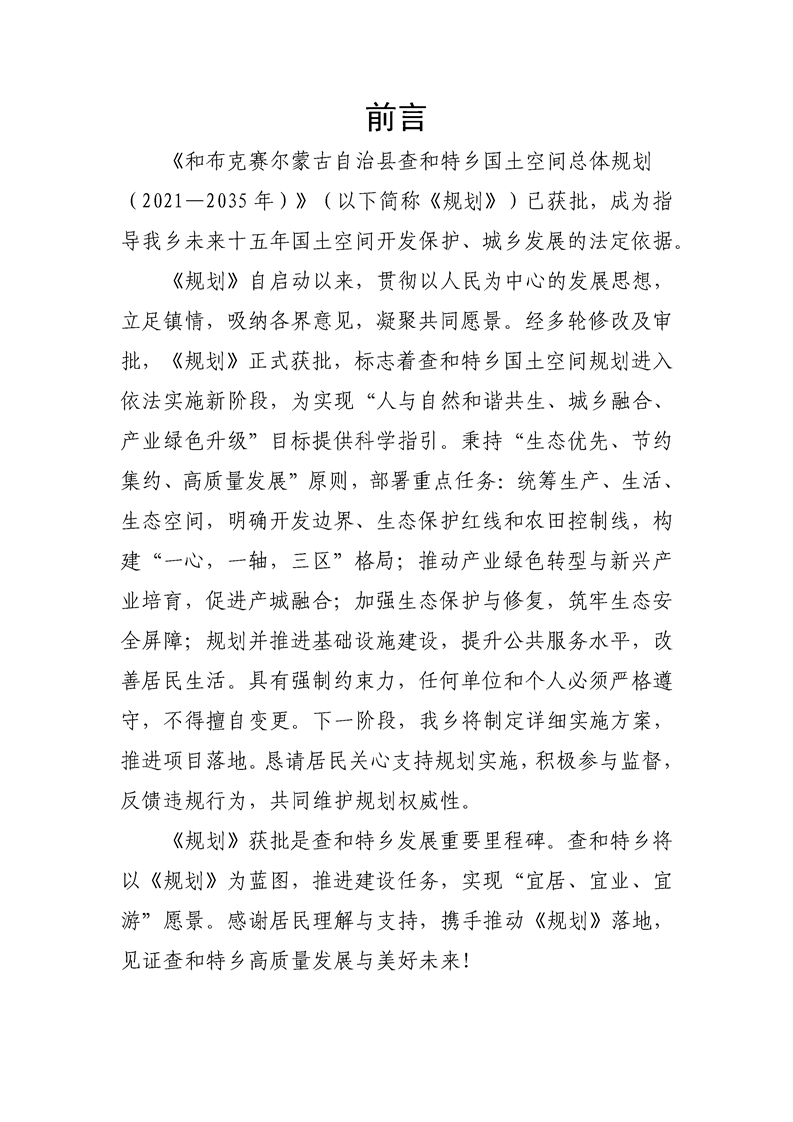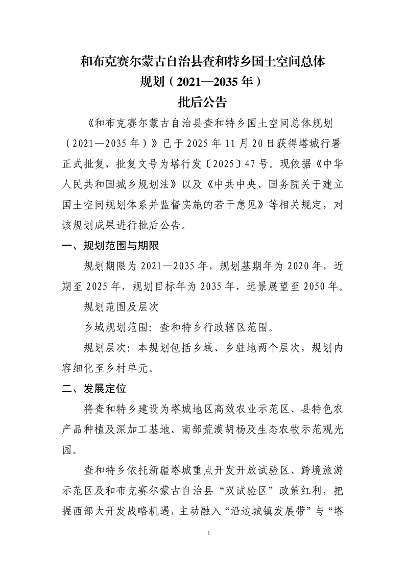 和布克赛尔蒙古自治县查和特乡国土空间总体规划(2021-2035年)批后公告