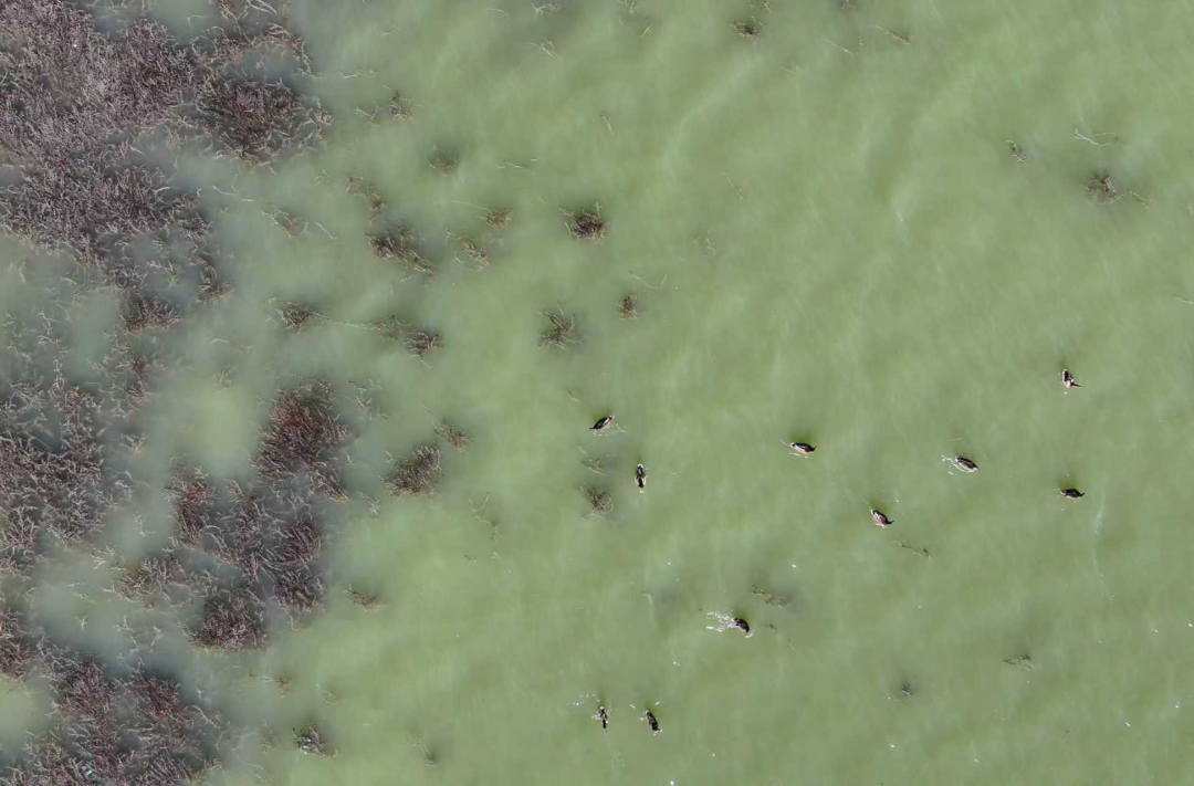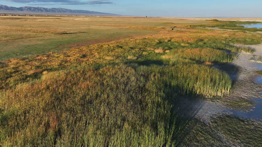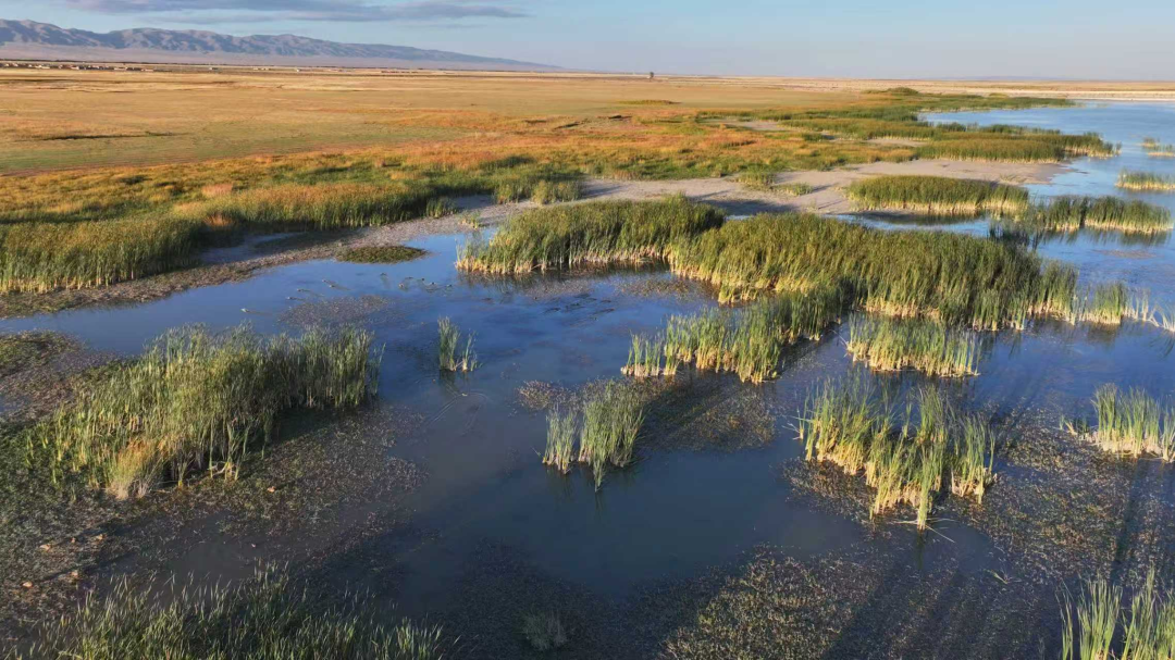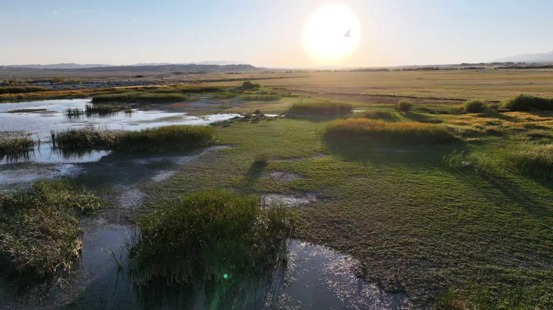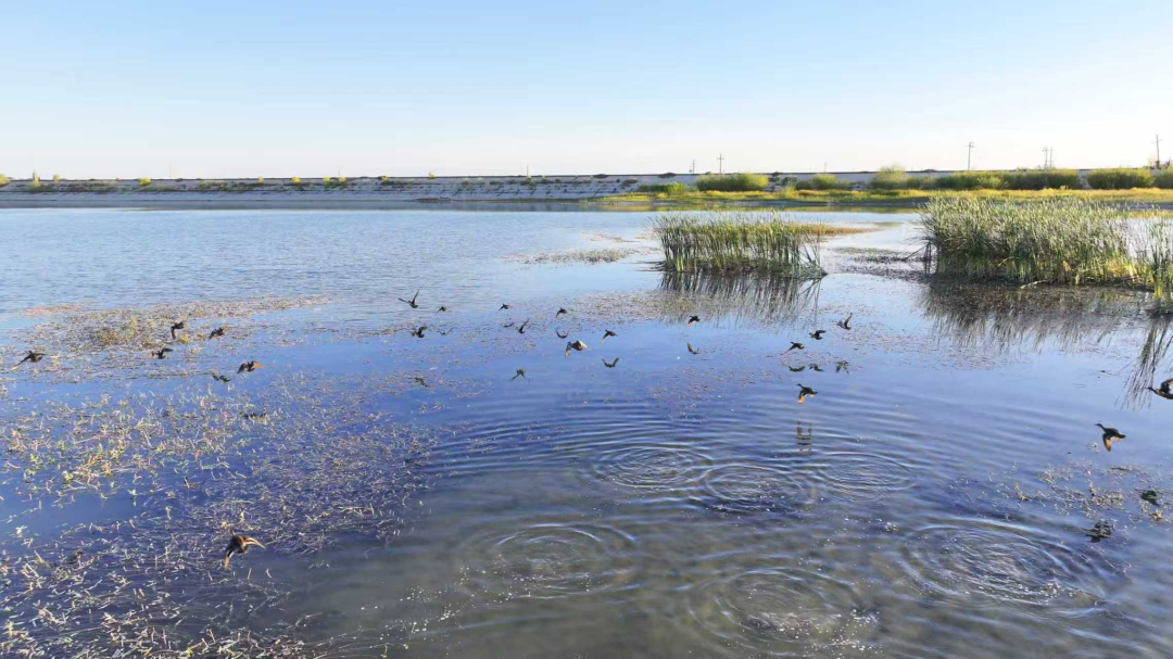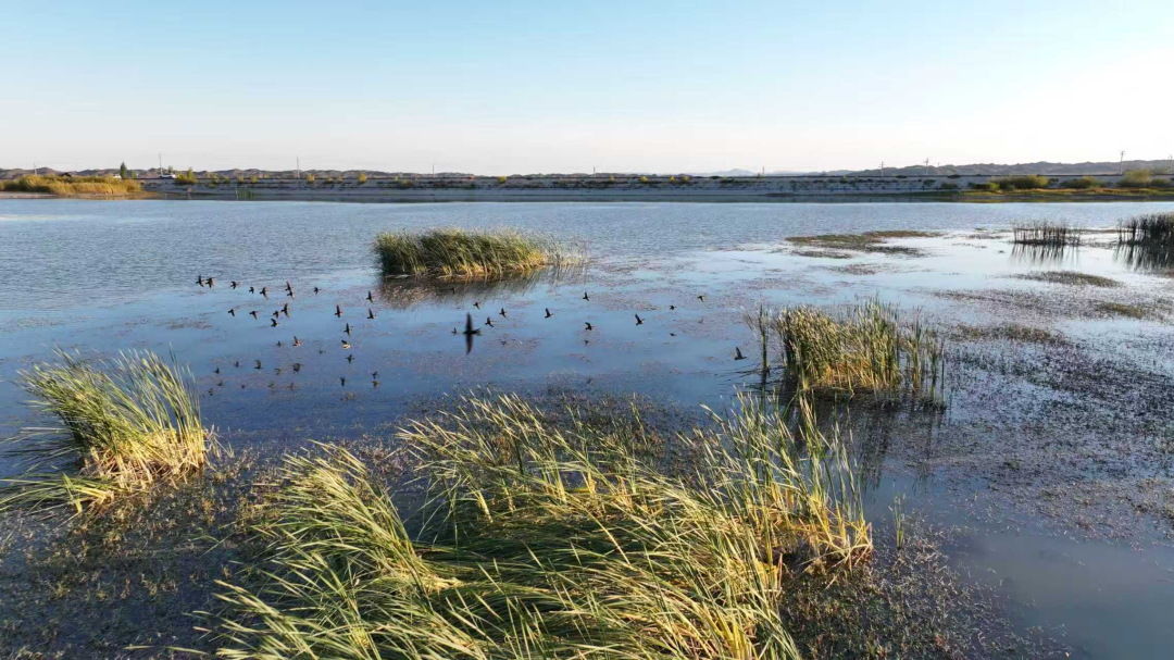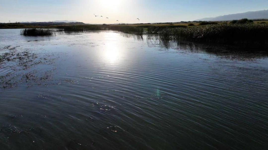 9月6日,和布克赛尔县查干库勒乡水库,碧水蜿蜒,环抱着渐渐染金的草原,湿地在秋阳映照下波光潋滟,成为南迁候鸟的中转驿站。成群的候鸟时而在低空盘旋,时而在浅水觅食,灵动的身影与远方层峦叠翠的青山相映成趣,静美的风景中跃动着自然的韵律。