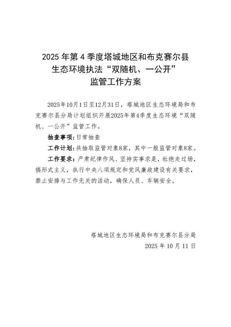 塔城地区和布克赛尔县生态环境执法“双随机、一公开”监管工作信息(第4季度事前公开)