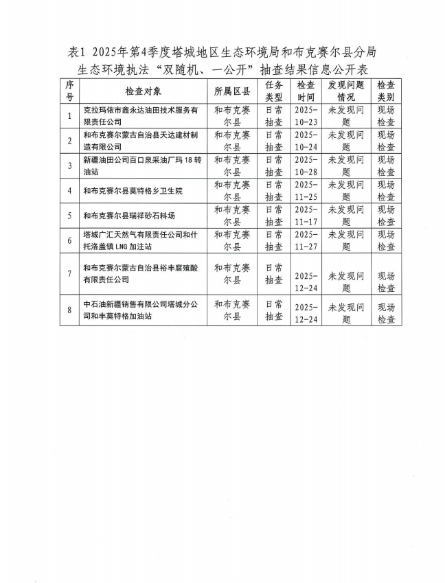 2025年第4季度塔城地区和布克赛尔县生态环境执法“双随机、一公开”监管工作信息公开