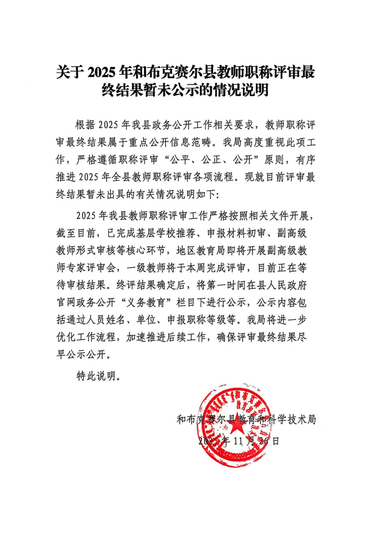 关于2025年和布克赛尔县教师职称评审最终结果暂未公示的情况说明