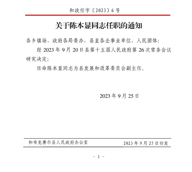 关于陈本显同志任免职的通知