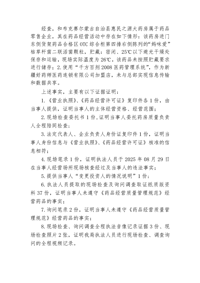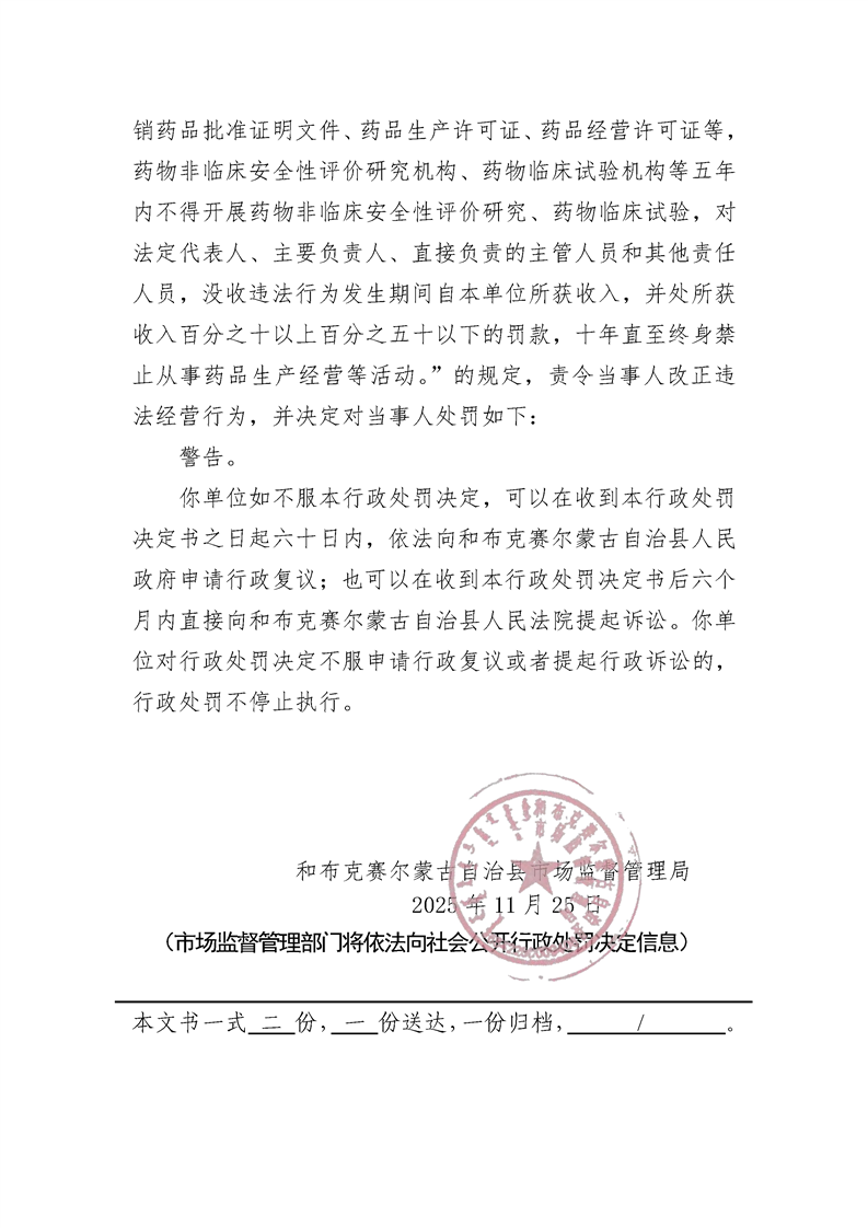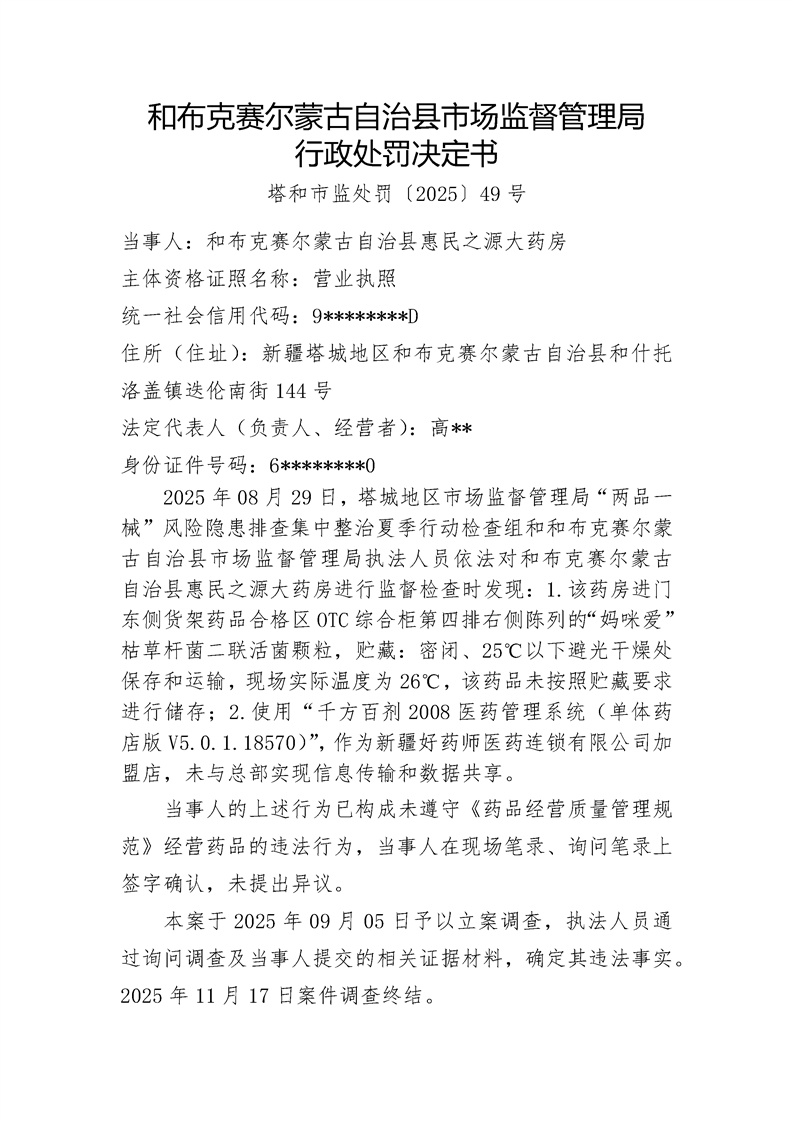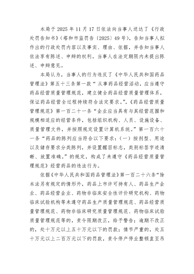 (药品监管)和布克赛尔蒙古自治县市场监督管理局行政处罚决定书 塔和市监处罚[2025]49号