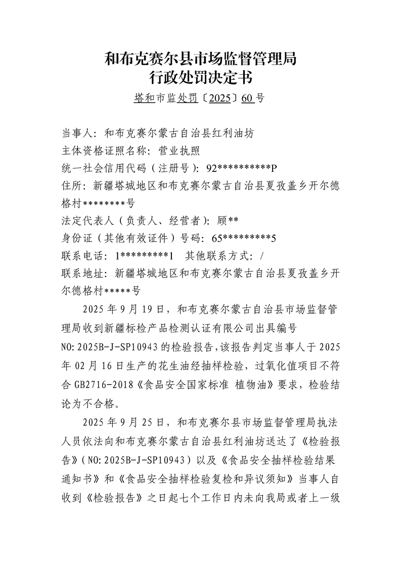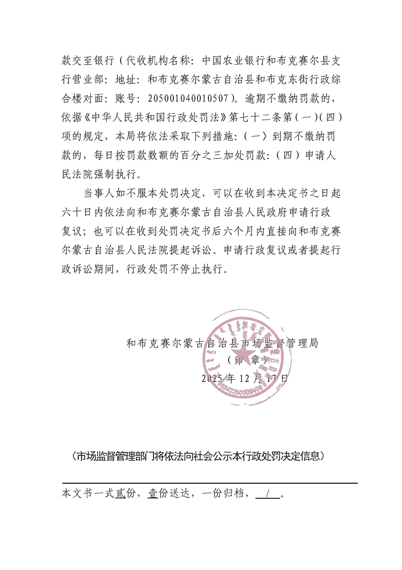 和布克赛尔蒙古自治县市场监督管理局行政处罚决定书(塔和市监处罚【2025】60号)