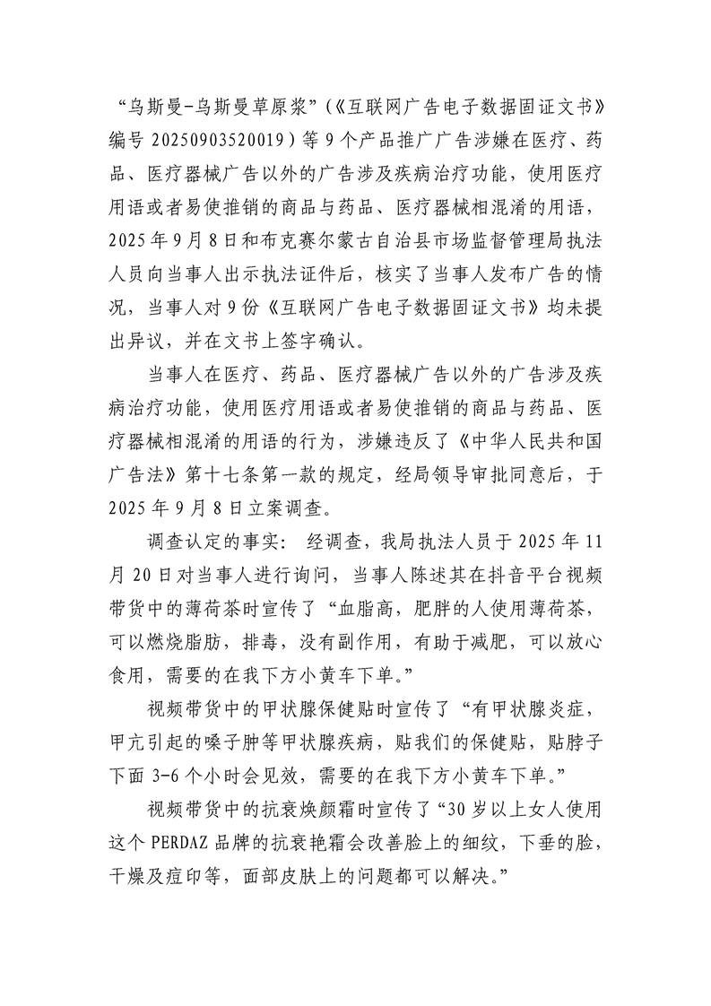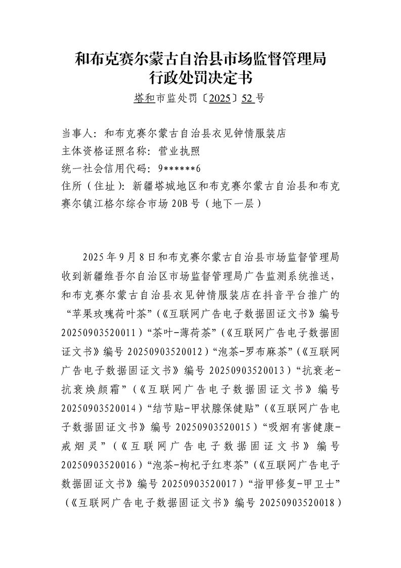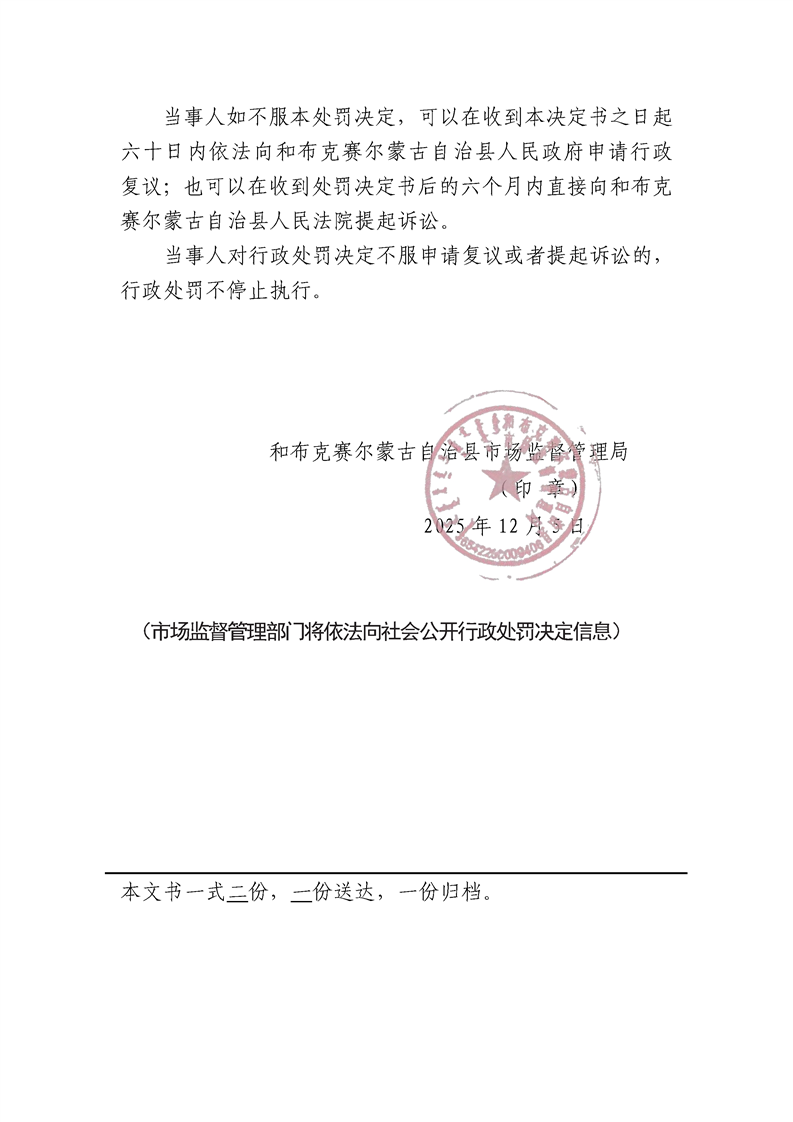 和布克赛尔蒙古自治县市场监督管理局行政处罚决定书 塔和市监处罚[2025]52号