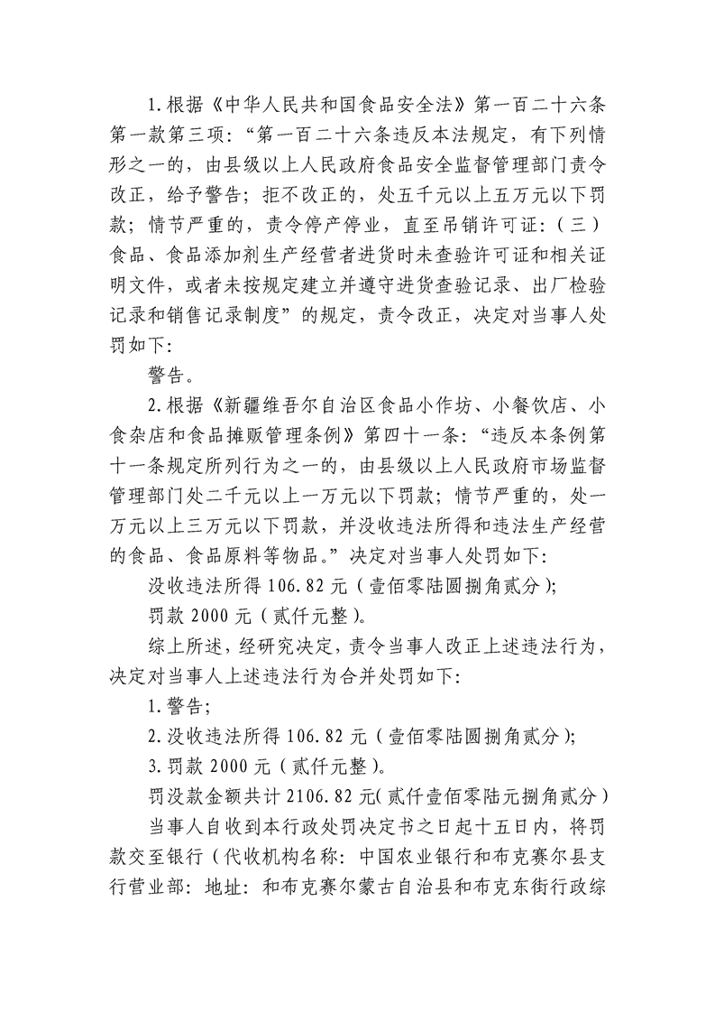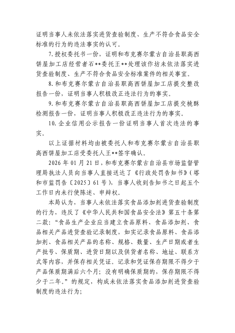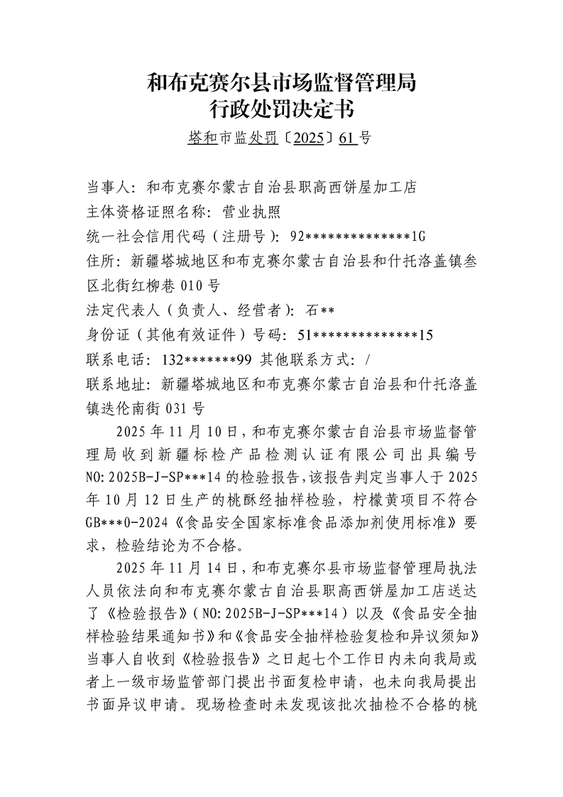 和布克赛尔蒙古自治县市场监督管理局行政处罚决定书 塔和市监处罚[2025]61号