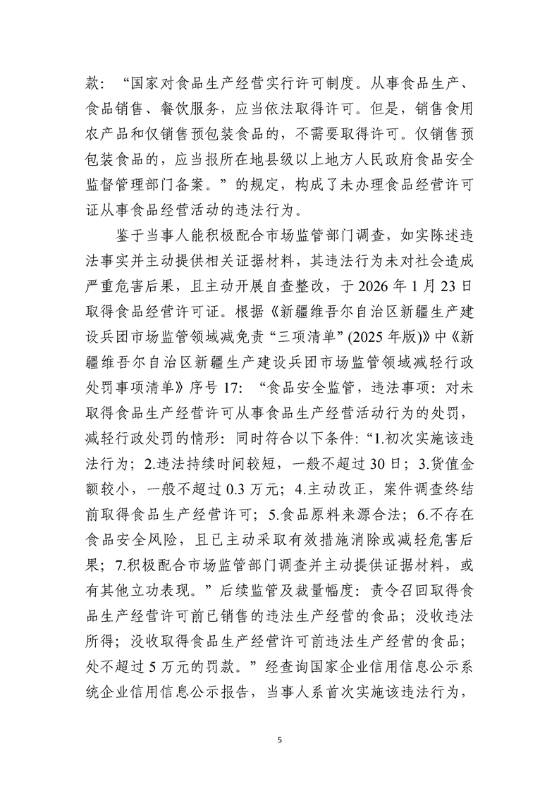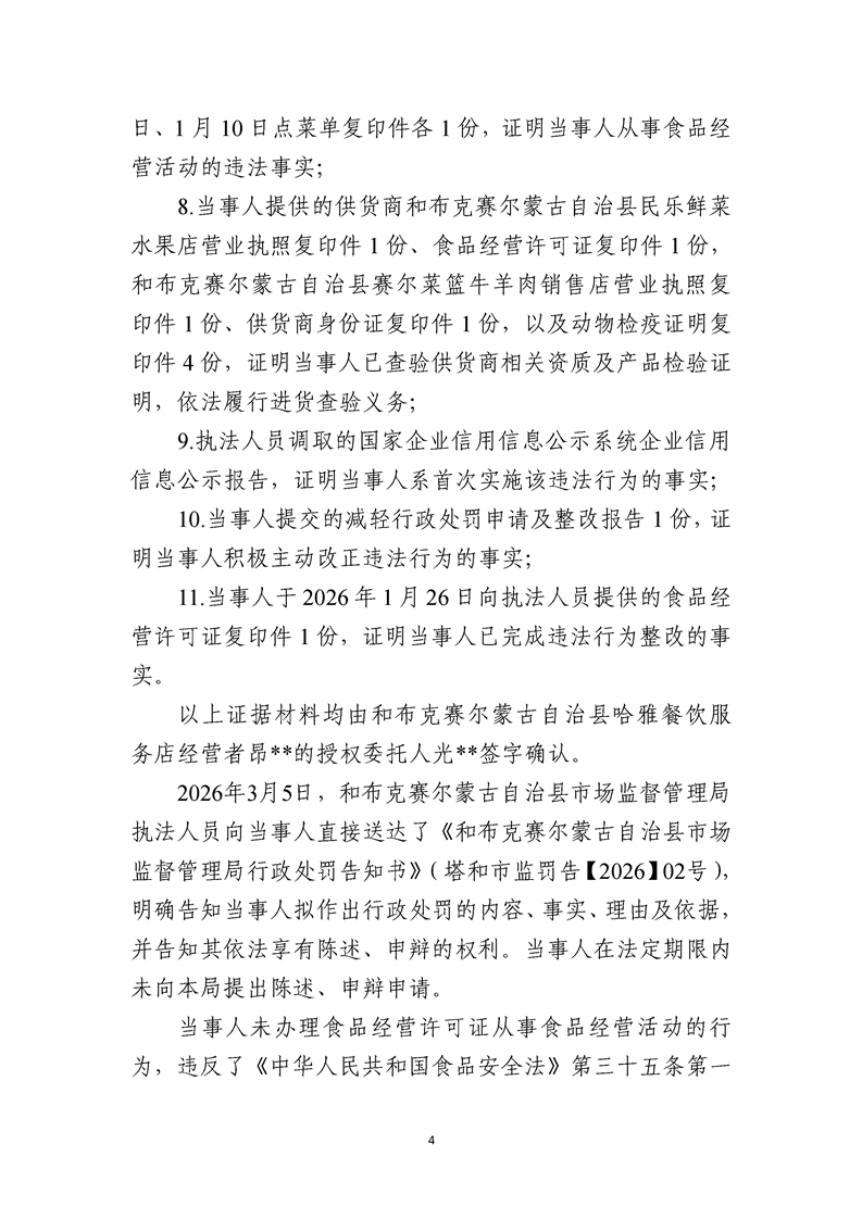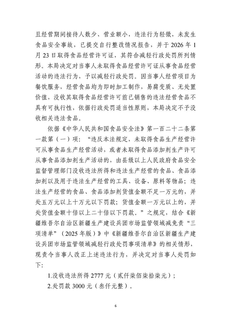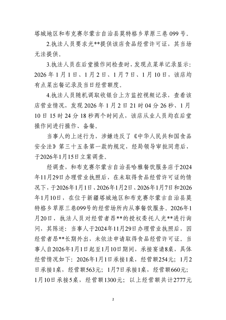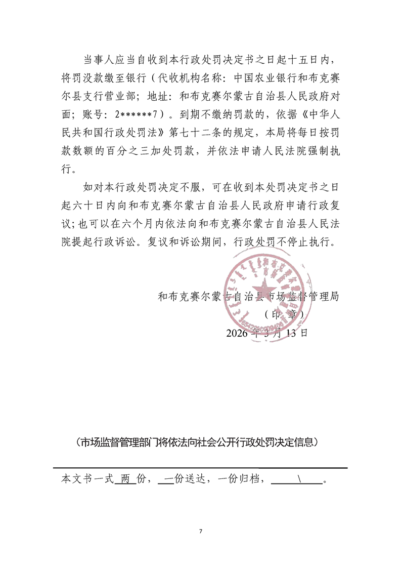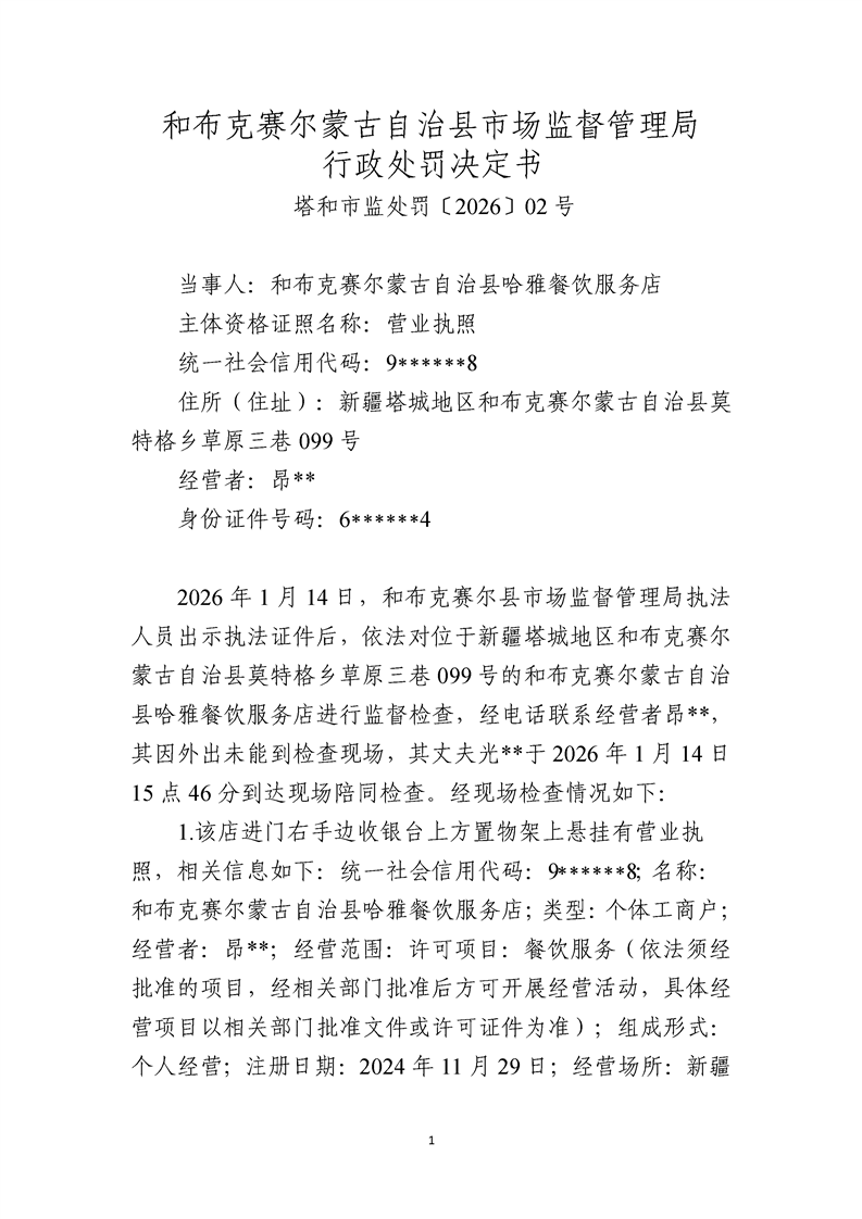 和布克赛尔蒙古自治县市场监督管理局行政处罚决定书 塔和市监处罚[2026]02号
