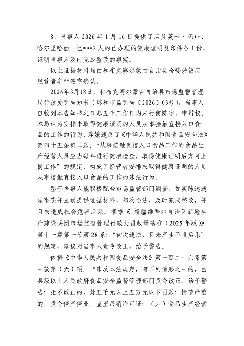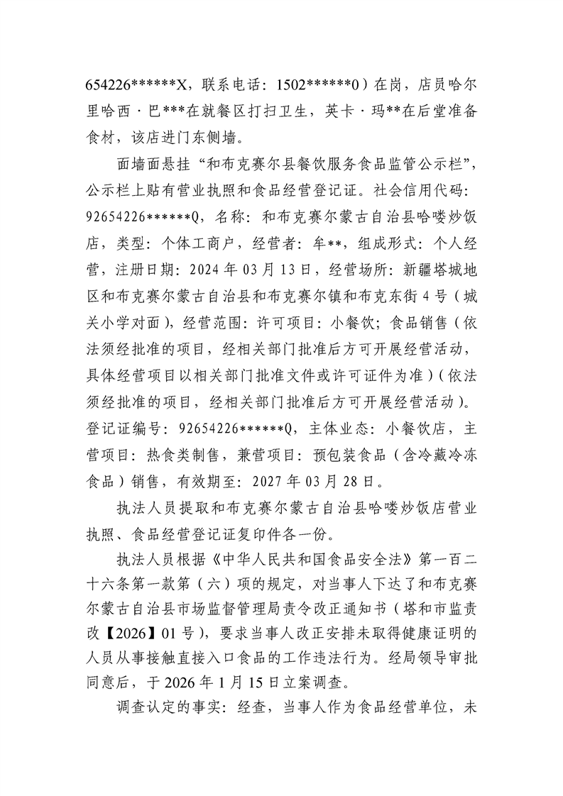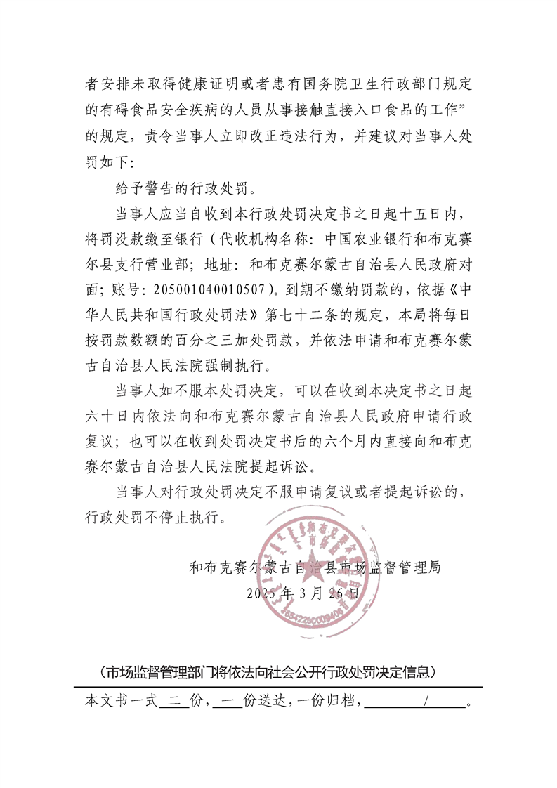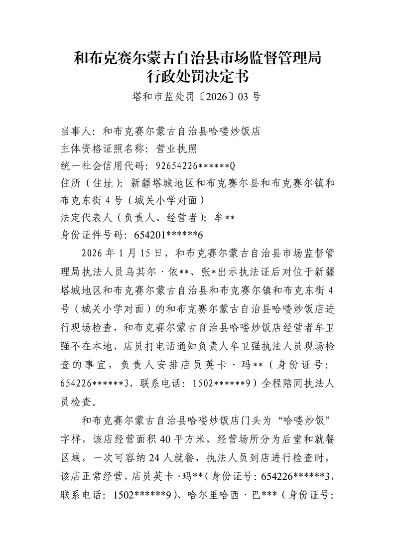 和布克赛尔蒙古自治县市场监督管理局行政处罚决定书 塔和市监处罚[2026]03号