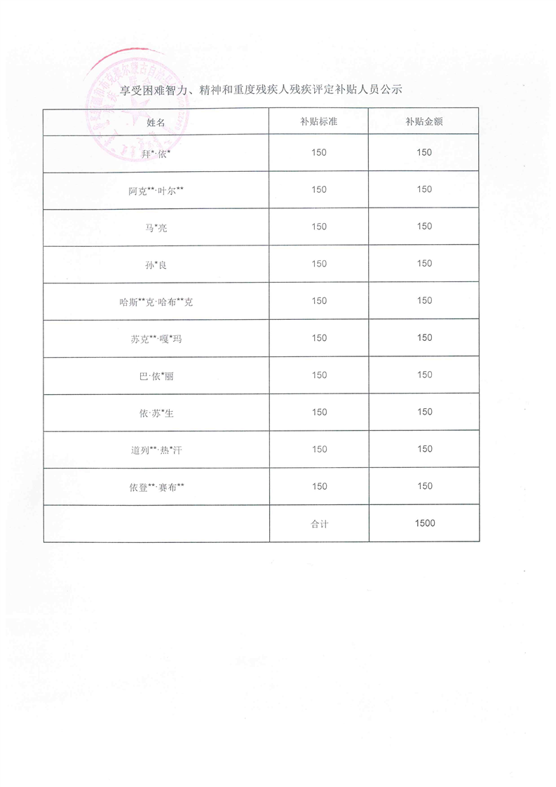 享受困难智力、精神和重度残疾人残疾评定补贴人员公示