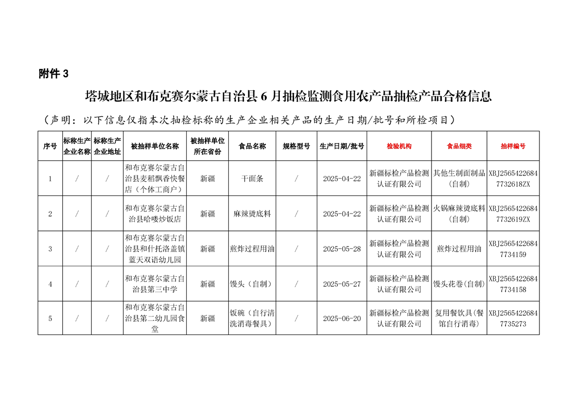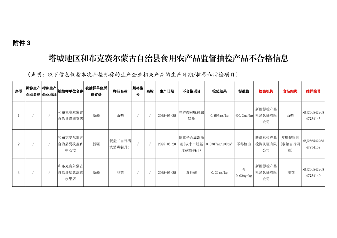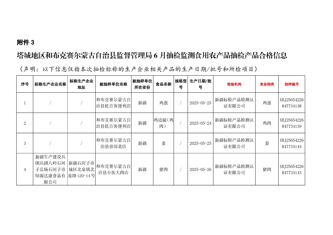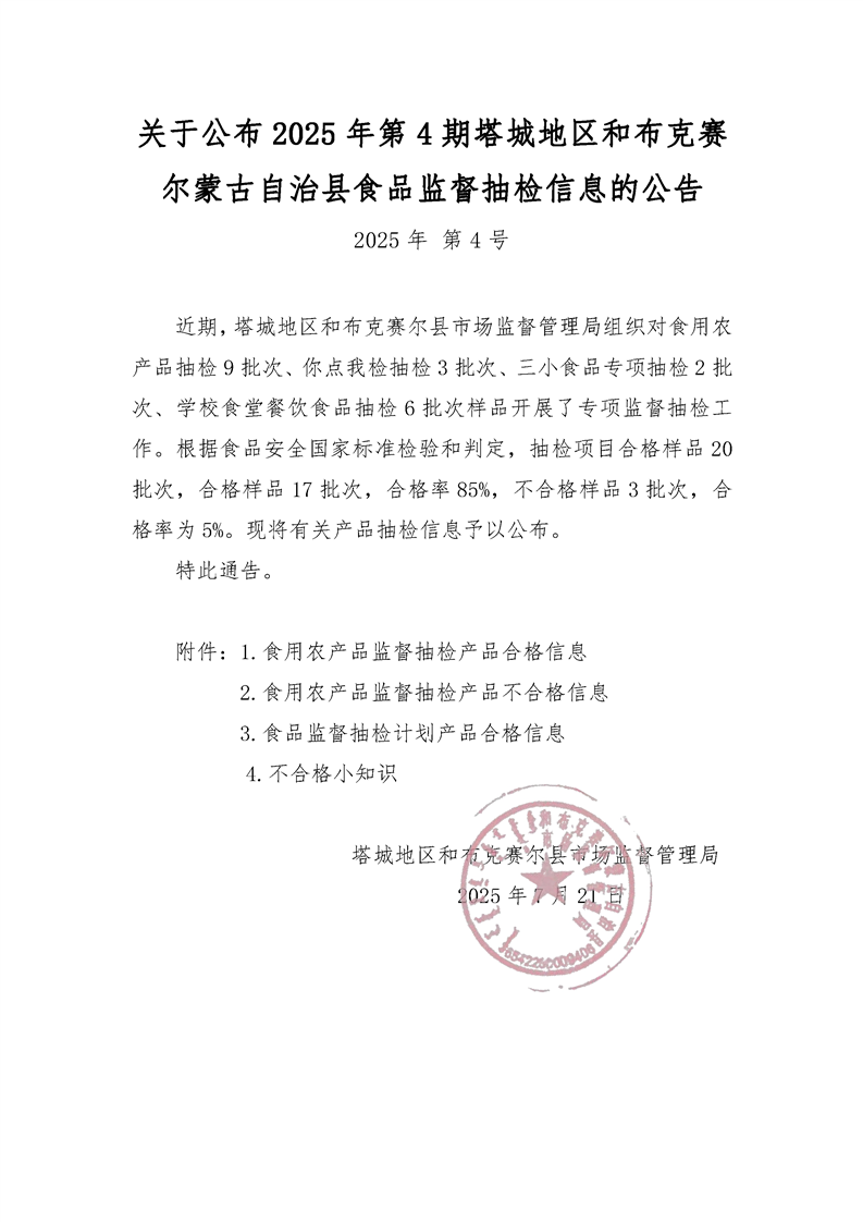 关于公布2025年第4期塔城地区和布克赛尔蒙古自治县食品监督抽检信息的公告
