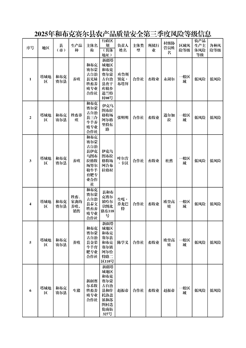 2025年和布克赛尔县农产品质量安全第三季度风险等级信息