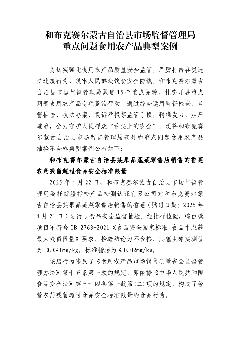 和布克赛尔蒙古自治县市场监督管理局重点问题食用农产品典型案例