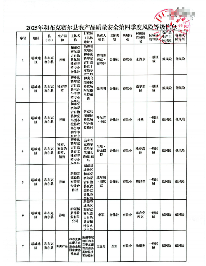 2025年和布克赛尔县农产品质量安全第四季度风险等级信息