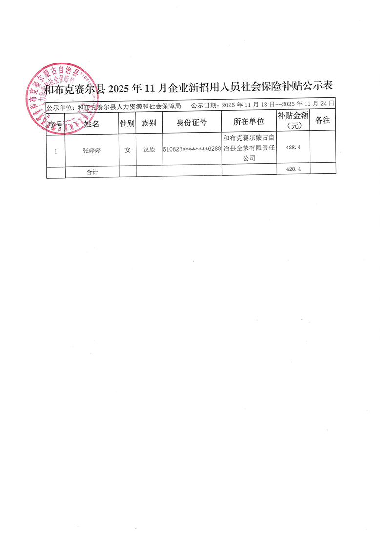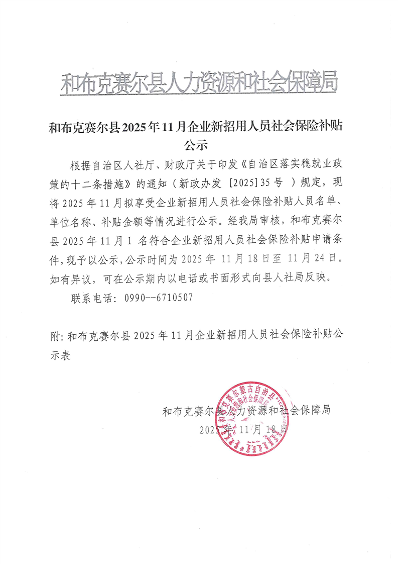 和布克赛尔县2025年11月企业招用人员社会保险补贴公示