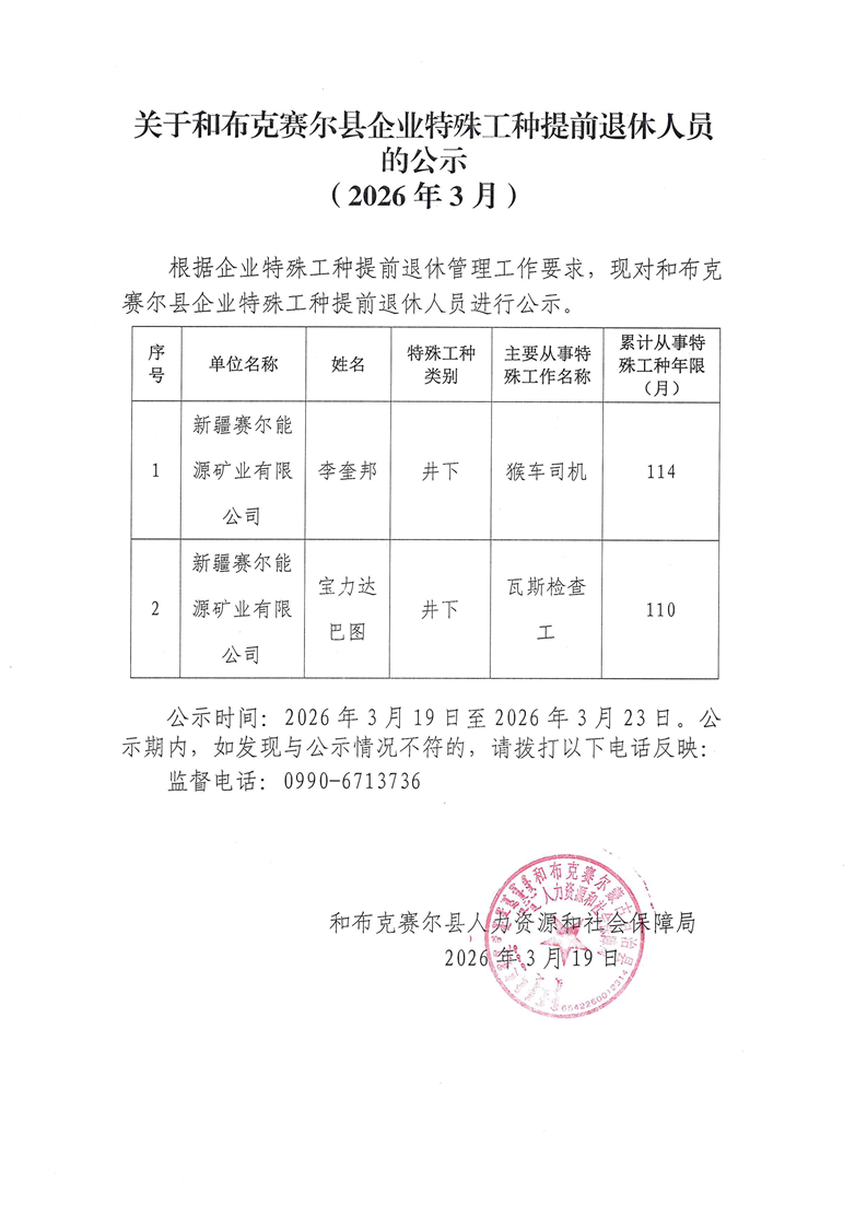 关于和布克赛尔县企业特殊工种提前退休人员的公示(20226年3月)