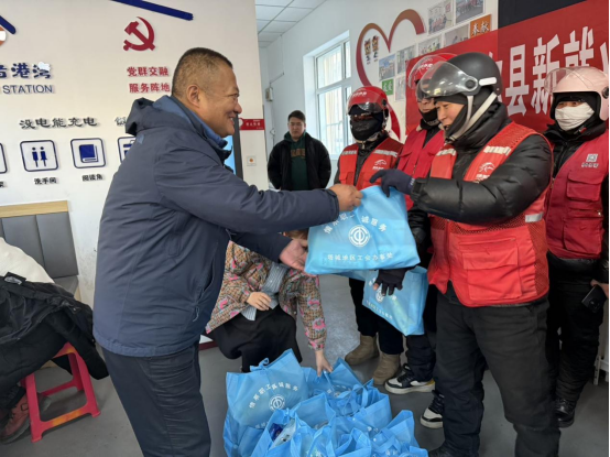 11月8日,和布克赛尔县总工会在工会驿站·人社站举行“暖新礼包”集中发放活动。150余份关爱送给快递员、外卖配送员、物流司机等新就业形态劳动者们。