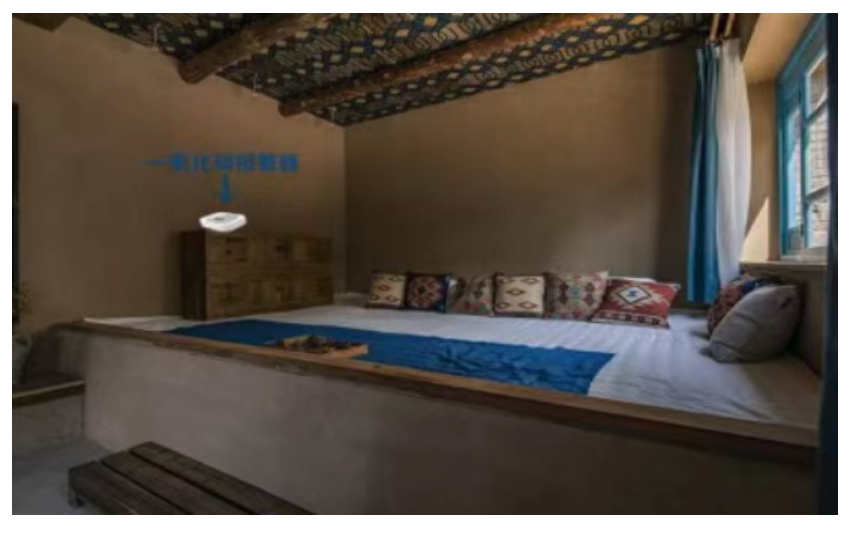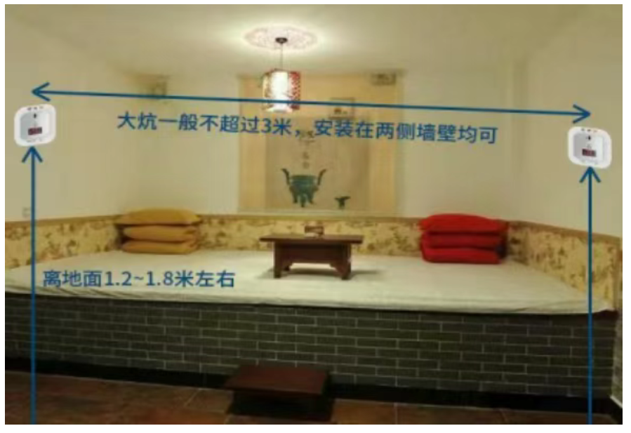 1、大炕场景安装位置:由于睡炕,一般是头朝外,脚朝里。所以,一氧化碳报警器安装在两侧墙壁较好。(如果头朝里面睡,空间比较窄,空气不流通,就容易吸入一些煤烟,可能会出现中毒现象或者呼吸困难等)。