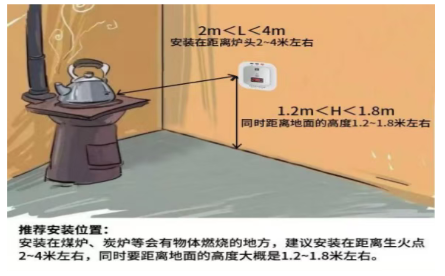 1.由于一氧化碳比空气轻,一氧化碳报警器应该安装在应离天花板 0.3m—1.2m 的位置,距离气源半径 1.5m 以内。