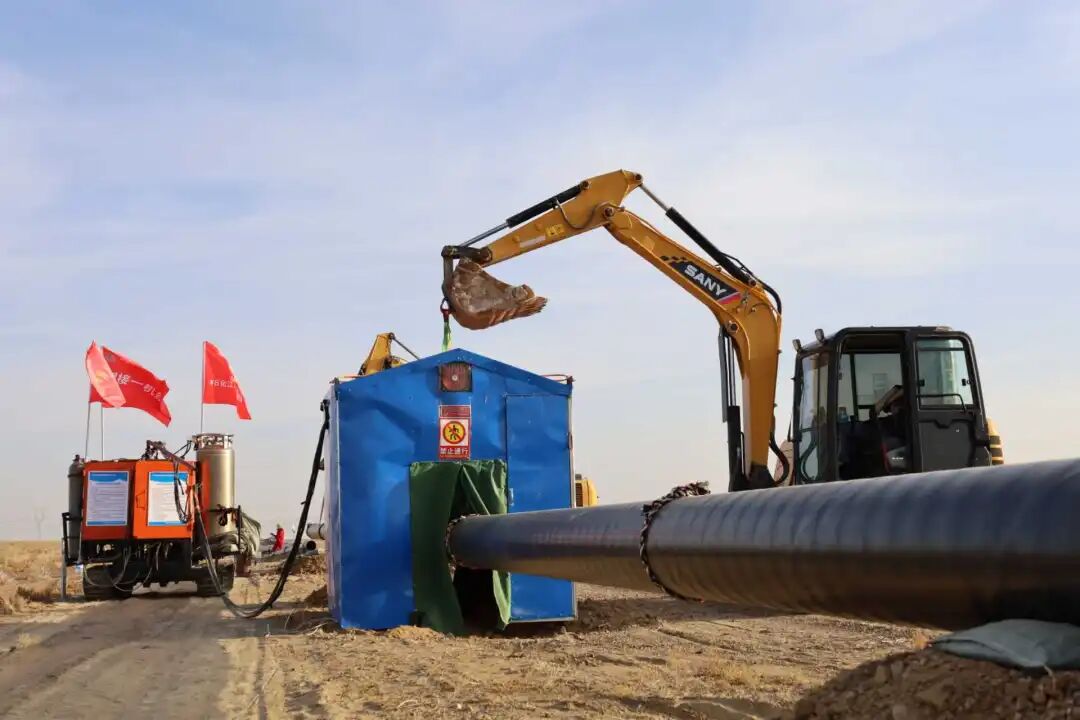 项目施工现场一派繁忙,50余名施工人员各司其职,16台套吊管机、移动电站等机械有序运转,焊接作业在专用作业房内规范推进。