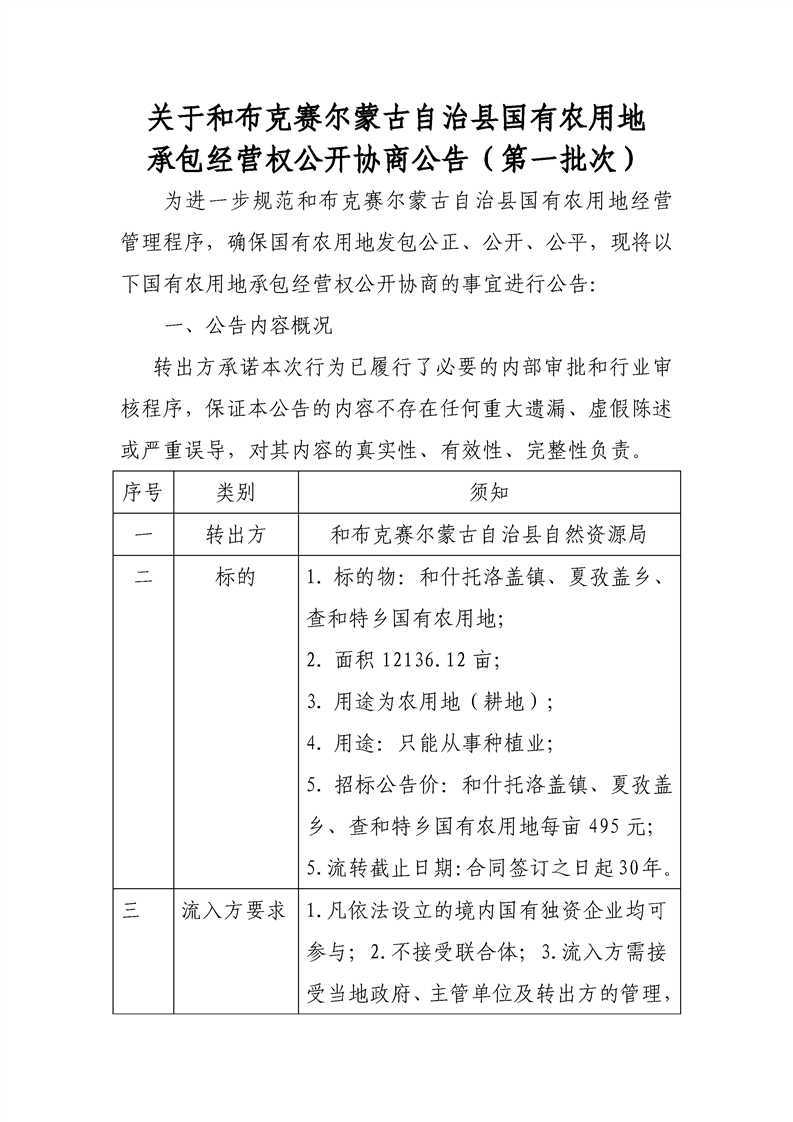 关于和布克赛尔蒙古自治县国有农用地承包经营权公开协商公告(第一批次)
