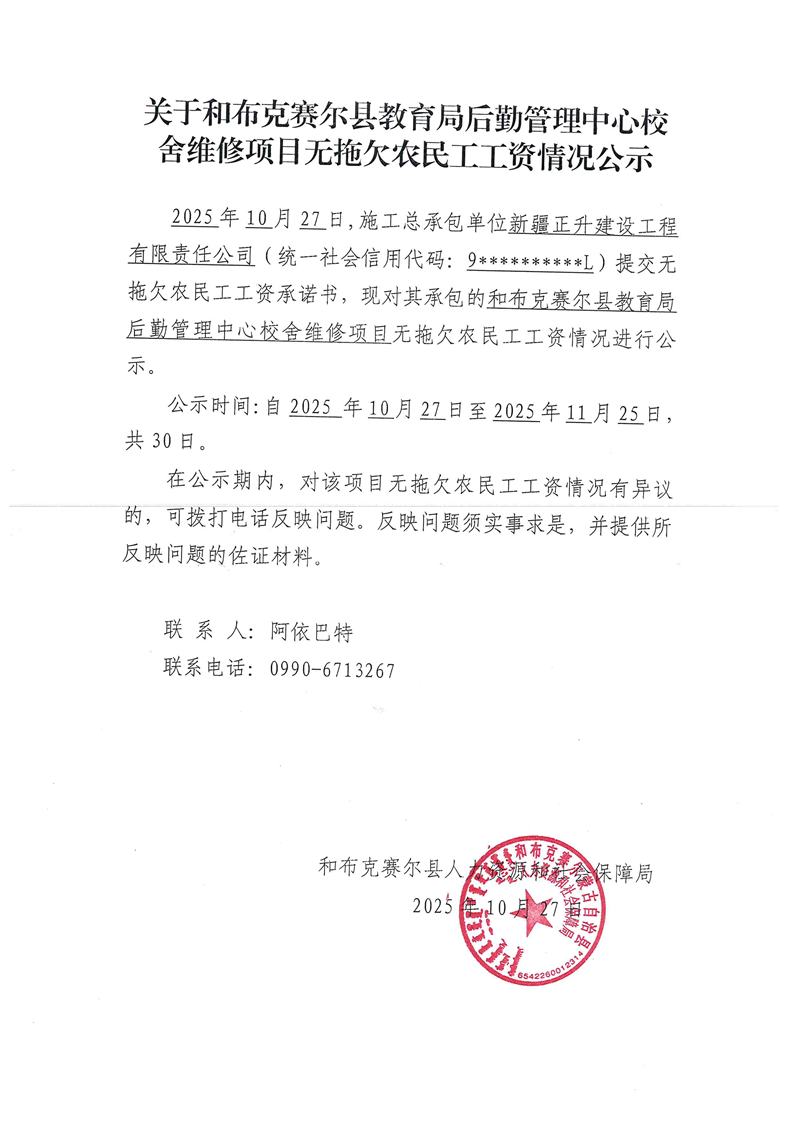 关于和布克赛尔县教育局后勤管理中心校舍维修项目无拖欠农民工工资情况公示