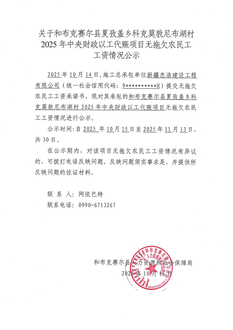 关于和布克赛尔县夏孜盖乡科克莫敦尼布湖村2025年中央财政以工代赈项目无拖欠农民工工资情况公示