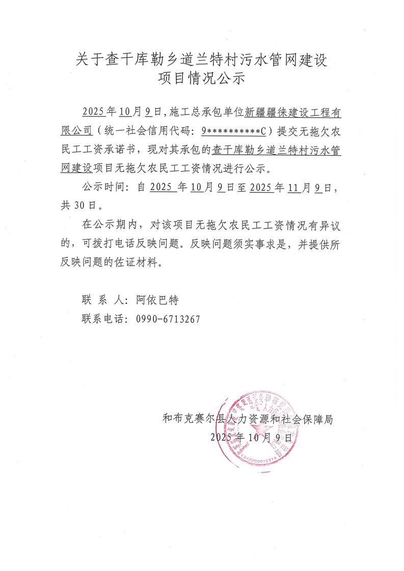 关于查干库勒乡道兰特村污水管网建设项目情况公示