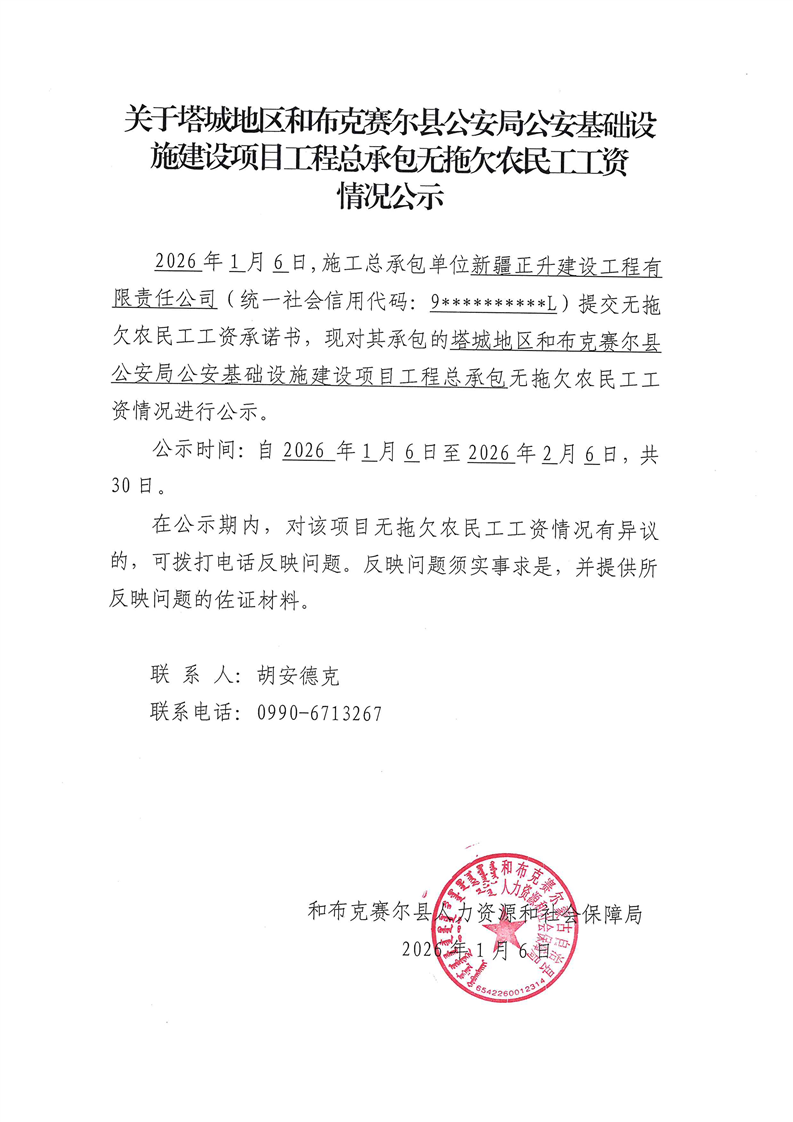 关于塔城地区和布克赛尔县公安局基础设施建设项目工程总承包无拖欠农民工工资情况公示